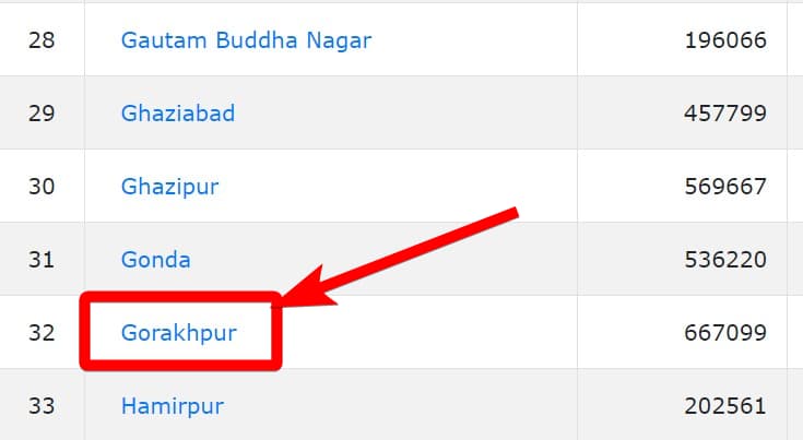 - वेबसाइट के होमपेज पर आपको जिले के नाम दिखाई देंगे। यहाँ पर आपको जिला गोरखपुर के ऊपर क्लिक करना होगा।