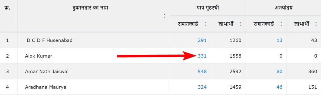 - अब आपके सामने अगला पेज खुल जाएगा। यहाँ पर आपको दुकानदार का नाम और राशन कार्ड का प्रकार जैसे पात्र गृहस्थी, अंत्योदय आदि दिखाई देंगे। यहाँ पर आपको अपने राशन के प्रकार को चुनकर उस संख्या पर क्लिक करना होगा। जैसा की आप नीचे फोटो में देख सकते है.