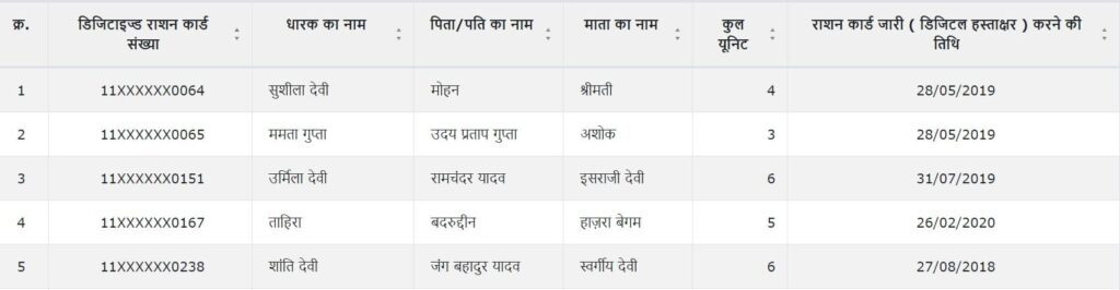 - इस लिस्ट में आपको राशन कार्ड संख्या धारक का नाम, पिता/ पति का नाम आदि जैसी जानकारी देखने को मिलेगी।