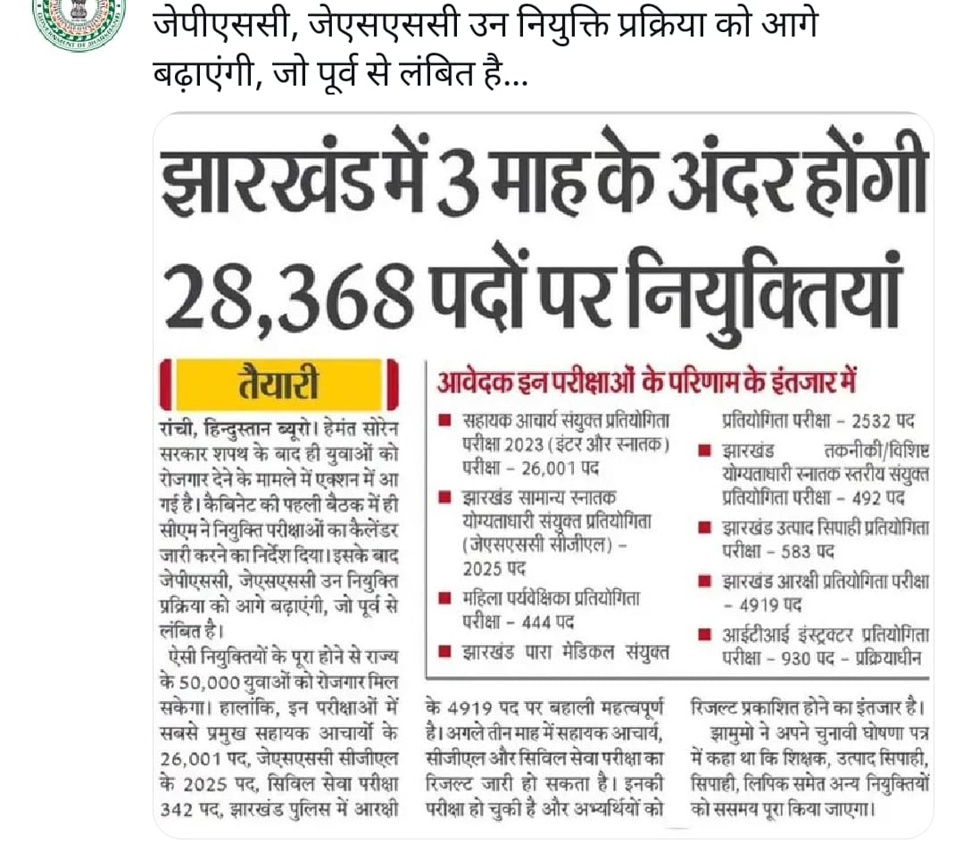 इसके अलावा, झारखंड सरकार अन्य विभागों में 49,417 पदों पर भी नियुक्तियों की योजना बना रही है।