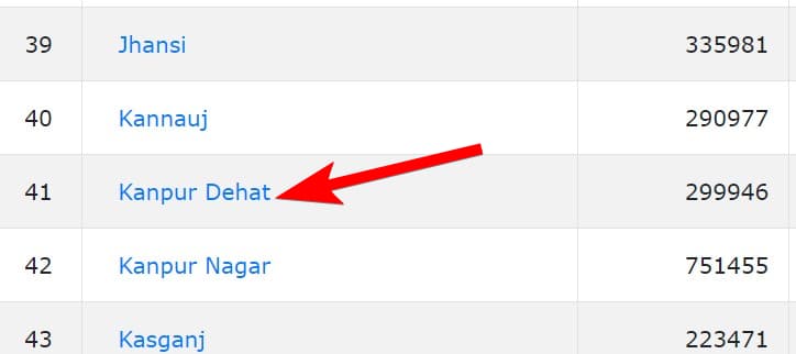 - वेबसाइट के होमपेज पर आपको उत्तर प्रदेश के जिलों की लिस्ट मिलेगी। यहां पर आपको जिला कानपुर देहात का चुनाव करना होगा। जैसा की आप नीचे देख सकते है।
