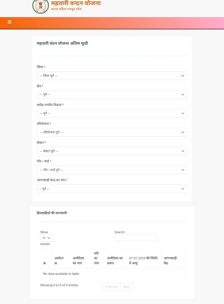 - लॉगिन विकल्प पर क्लिक करें। महतारी वंदन योजना आवेदन पत्र खुल जाएगा।