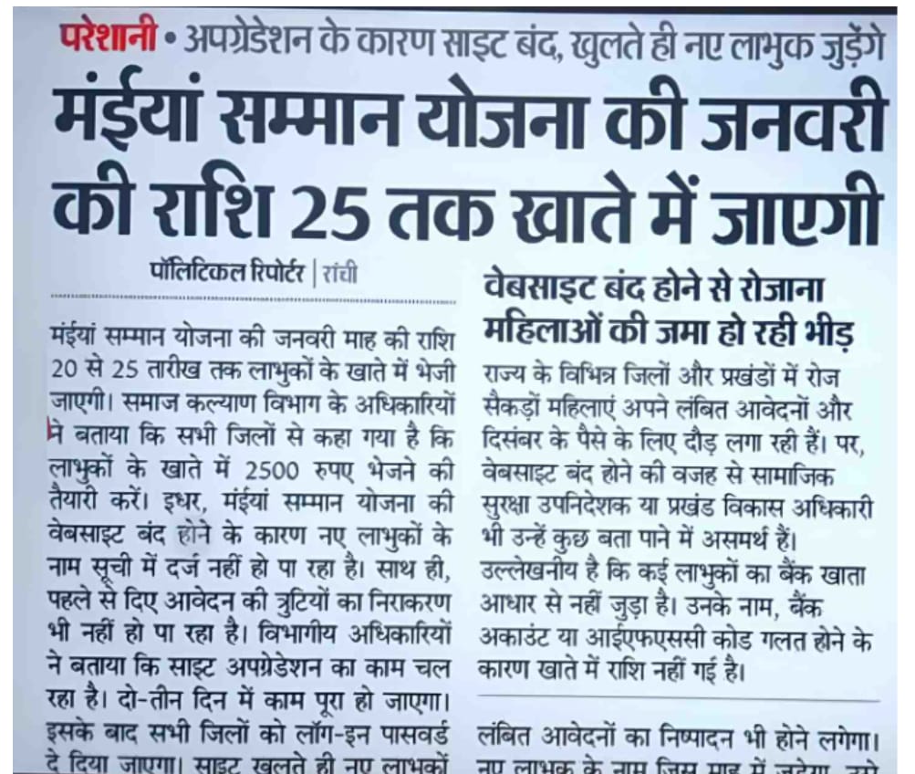 झारखंड सरकार ने 2023 में महिलाओं के सशक्तिकरण और वित्तीय मदद के उद्देश्य से मंईयां सम्मान योजना की शुरुआत की थी। इस योजना के तहत, राज्य की 56 लाख महिलाओं को हर महीने ₹2500 की आर्थिक सहायता दी जाती है। 18 से 50 वर्ष तक की महिलाएं इस योजना का लाभ उठा रही हैं।