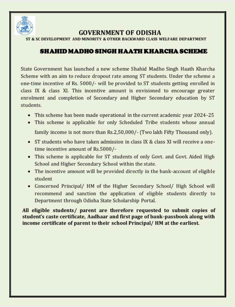 | पात्रता | – ओडिशा राज्य का स्थायी निवासी – SC/ST/OBC/EBC/SEBC/General श्रेणी के छात्र – निर्माण श्रमिक का बच्चा |