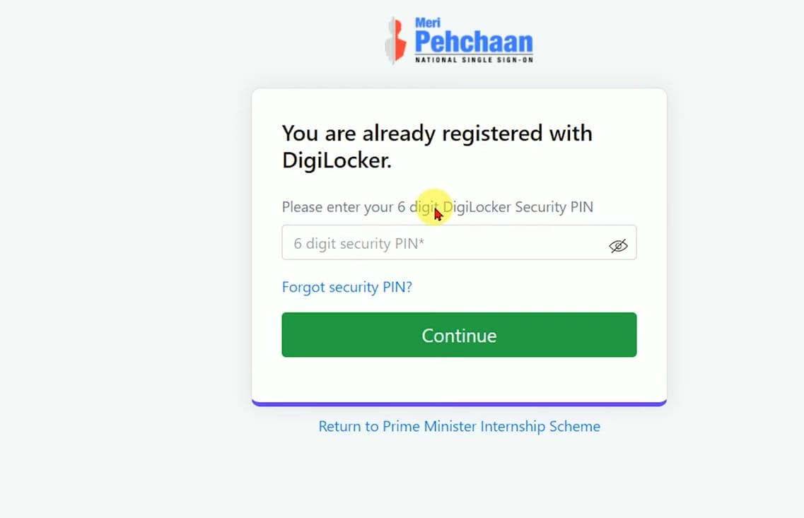 - यदि आपने डिजिलॉकर का पहले रजिस्ट्रेशन किया है तो उसका पिन डालकर कंटिन्यू पर क्लिक कीजिए.