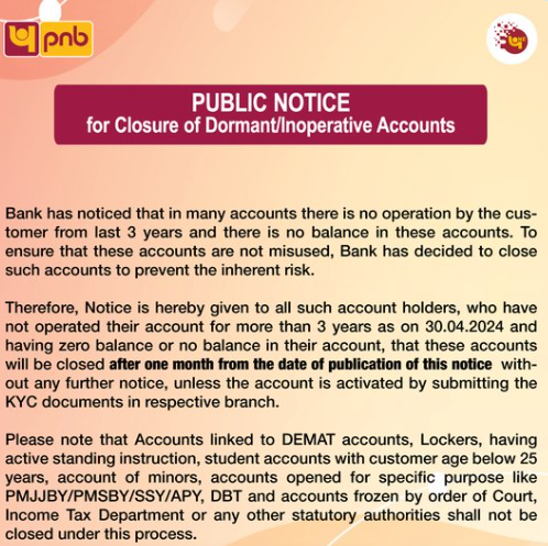 आप सभी को जानकारी के लिए बता दे की यदि कोई कस्टमर लंबे समय से अपने सेविंग अकाउंट का इस्तेमाल नहीं करता है तो उस अकाउंट पर बैंक की नजर नहीं होती है, जिसकी वजह से बहुत से स्कैमर उस अकाउंट का गलत तरीके से इस्तेमाल करते हैं तो इसी चीज को खत्म करने के लिए पंजाब नेशनल बैंक ने यह बड़ा फैसला लिया है कि यदि कोई भी ग्राहक पिछले 3 साल से अपने अकाउंट में लेन-देन नहीं कर रहा है तो उसके अकाउंट को अब बंद कर दिया जाएगा।