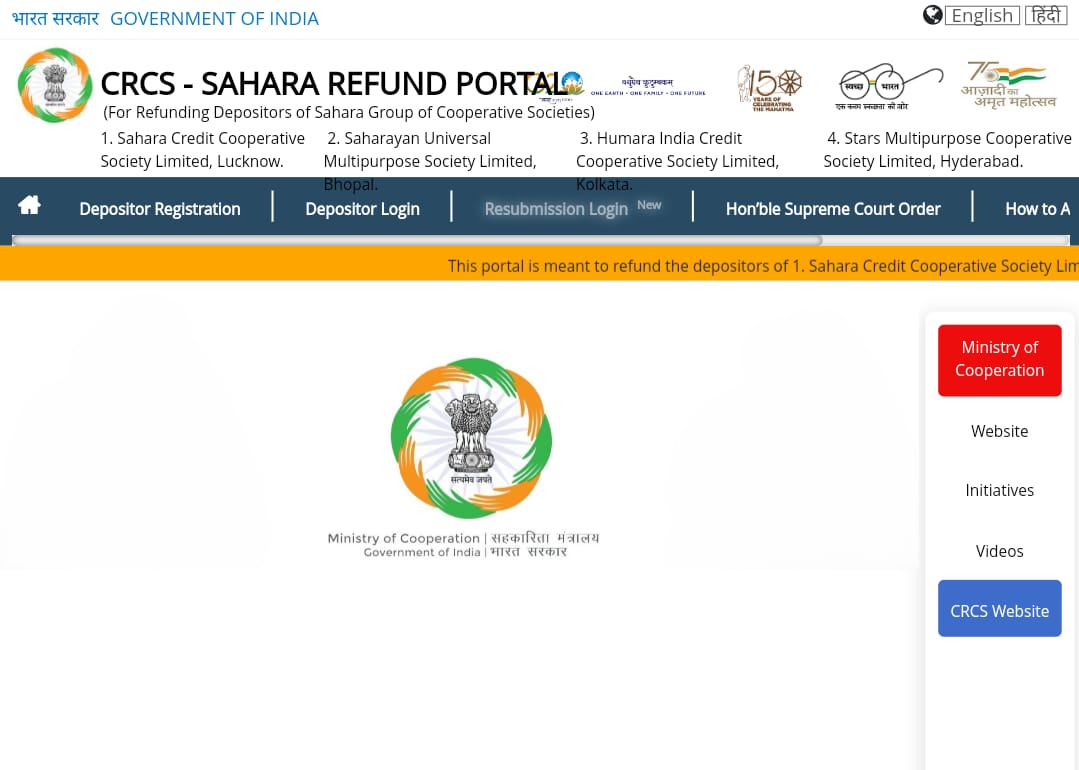 सहारा इंडिया द्वारा 4 सहकारी समितियों के निवेशकों के लिए यह पोर्टल जारी किया गया है। जिन निवेशकों ने रजिस्ट्रेशन पूरा कर लिया है और जिनका वेरिफिकेशन सफलतापूर्वक हो गया है, उन्हें उनकी राशि लौटाई जा रही है।